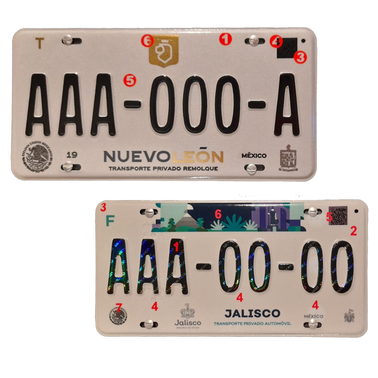 Cumplen con la Norma oficial Mexicana NOM-001-SCT-2-2016, que regula las especificaciones técnicas y características de las Placas y Tarjetas de Circulación para automóviles, autobuses, camiones y remolques matriculados en la República Mexicana.